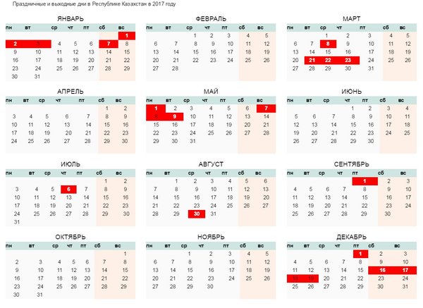 3 декабря) Национальные праздники и их переносы День Независимости 16 декабря, отмечаемый 16*-17* декабря (выпадают на выходной переносятся на 18** -19 декабря); (*) При совпадении выходного и праздничного дней выходным днем является следующий после праздничного рабочий день. (**) условие действует для пятидневной рабочей недели, для шестидневной рабочей недели является рабочим днем Первый день Курбан-айта, отмечаемого по мусульманскому календарю, 7 января — православное Рождество являются простыми выходными днями. В 2017 году 7 января выпадает на субботу — это обычный выходной день без переносов. В 2017 году первый день Курбан-айта приходится на 1 сентября 2017 года.