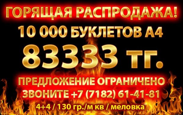 Горящая распродажа от 11.03.16! Листовка А6 — 20 000 экз. или Листовка А5 — 10 000 экз. или Листовка 100х210 мм — 15 000 экз. 4+4 — полноцветная печать с двух сторон бумага 130 гр./кв м, глянец СУПЕР цена — 43 999 тг. за тираж!