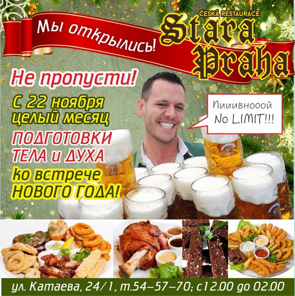 В честь открытия ресторана Старая Прага, с 22 ноября объявляется месяц подготовки тела и духа ко встрече Нового 2017 года! В программу тренировки входят: Пивной NO LIMIT- 2000 тенге (пиво Прага) Большая пивная тарелка NO COMENT всего за 2000 тенге + малая пивная тарелка в подарок Закажи одно горячее блюдо, гренки по чешски и стопочку водки дадим так При заказе фирменного блюда «Печено вепрево колено» — порция медовых крылышек С НАС! Мы ждем вас ГУРМАНЫ и ПИВОМАНЫ с 12 дня до 2-х ночи каждый день в ресторане Старая Прага по адресу: ул. Ката… — Читать дальше