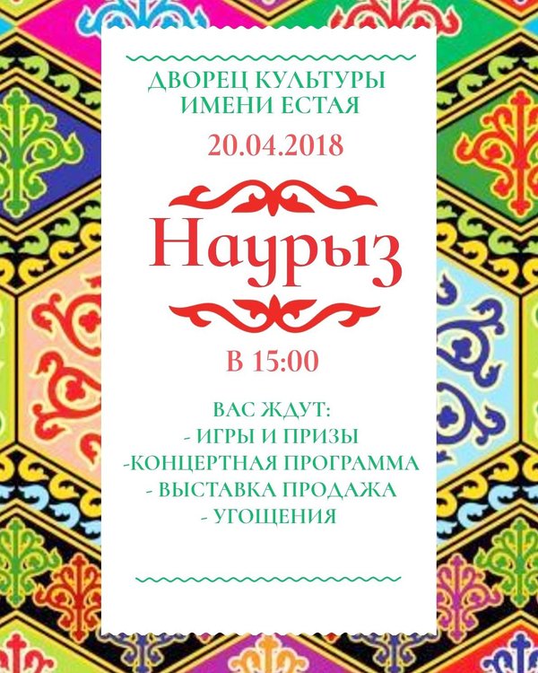 ️Уважаемые жители и гости нашего города⁉ Приглашаем вас на праздничное мероприятие посвященное Наурызу! Вас ждут: интересные игры и подарки концертная программа коллективов дворца выставка продажа павлодарских мастеров вкусные угощения