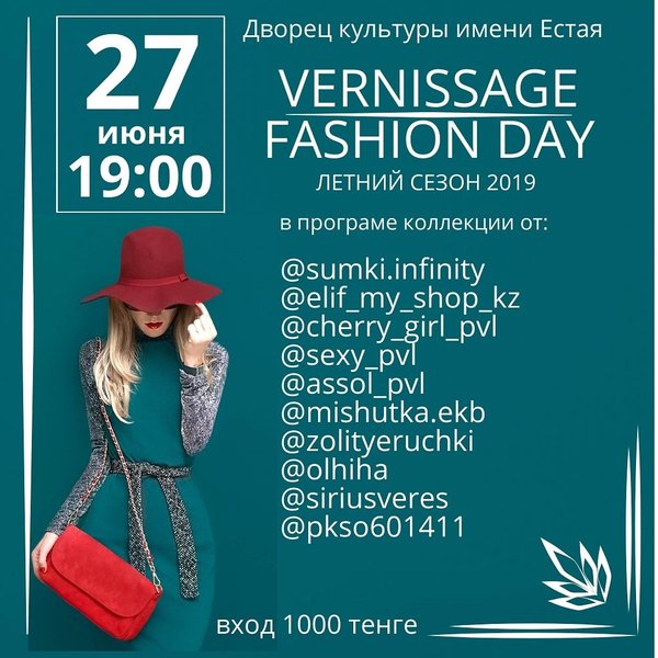 Не пропусти главное fashion событие 2019 года!!! 27 июня в 19:00 на подиуме Театра моды «Vernissage» @vernissagestyle Дворца культуры имени Естая состоится показ коллекций весна-лето 2019 модных салонов одежды города Павлодара. Летние комплекты, платья для особых случаев, костюмы, детская и молодежная одежда, бижутерия, сумки и аксессуары и многое другое. Также будут представлены авторские коллекции павлодарских дизайнеров. Во время показа будет проходить аттестация школы моделей театра моды«Vernissage», на которой выпускники продемонстр… — Читать дальше