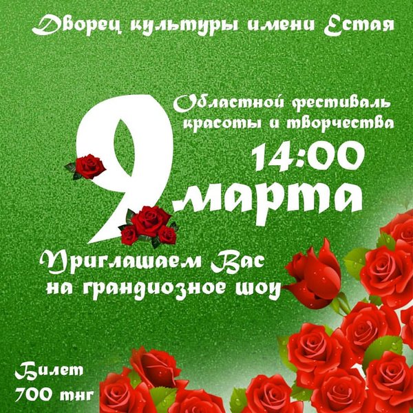 Александра Дюпина (01.03.2018): Приглашаем Вас на грандиозное шоу Областной фестиваль красоты и творчества ДК им.Естая (ГДК), большой зал 9 марта 14:00 цена билета 700 тенге #