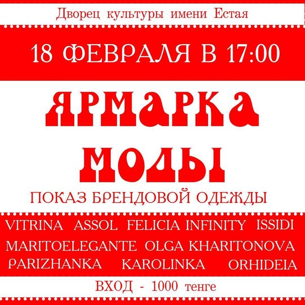 Александра Дюпина (14.02.2018): Вы готовы к Весне? Специально для Вас «Ярмарка моды» Приходи не скупись… Яркие сумки Стильные польто Костюмы в стиле Кэжуал И платья для особого случая Будь неотразима этой в весной с vernissagestyle В показе участвуют: issidi_pvl parizhanka_pavlodar orhideia_pvl detskaya_odezda_wojcik marito_elegante kvazar_3.114_vitrina assol.kvazar felicia_pavlodar sumki.infinity olhiha Спонсоры показа: muzobozpavlodar aifcosmetic.kz dk_estay_pvl