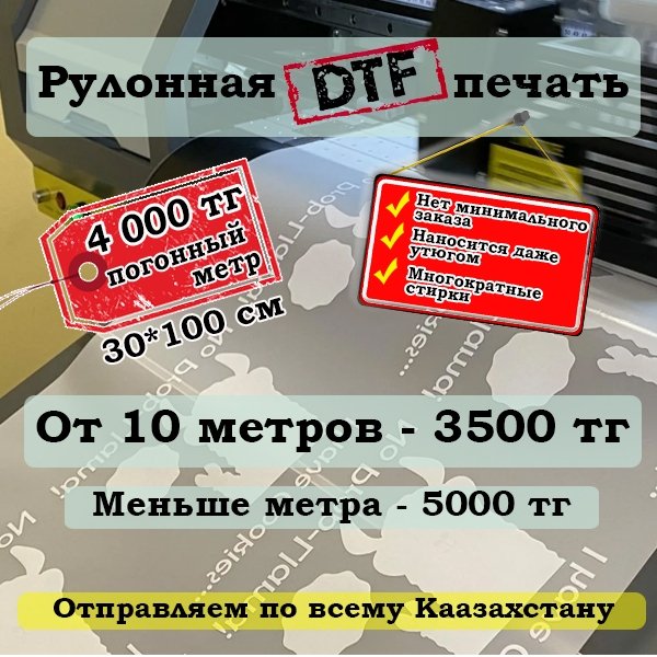 Доброго времени суток ======= Принимаем заказы на рулонную DTF печать! Ширина печати 30 см Цена погонного метра — 4000 тг От 10 метров — 3500 тг Меньше метра — 5000 тг ======= Наши преимущества: Нет минимального заказа Наносится даже утюгом Отправляем по всему Казахстану Короткие сроки Многократные стирки ======= Наши контакты: РК, г. Павлодар, ТД «Барыс, 2 таж, бутик 34