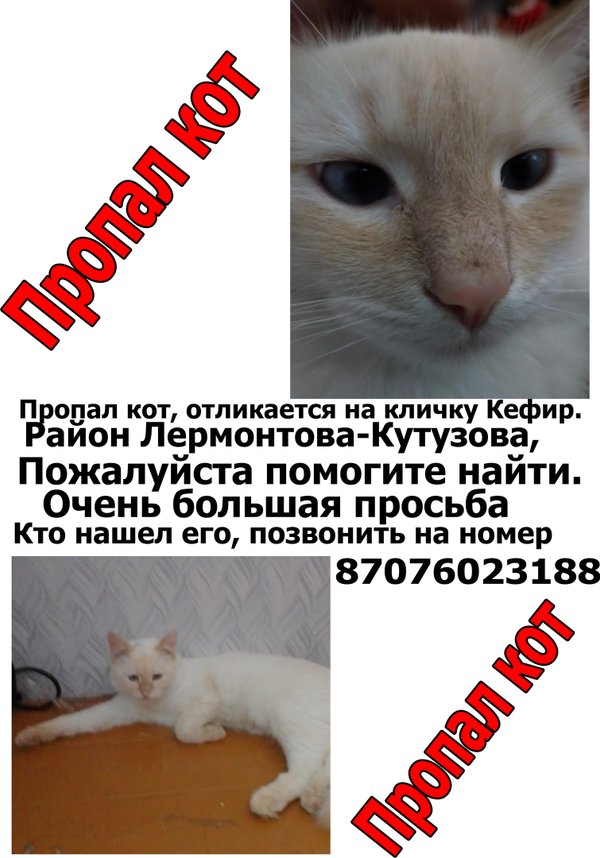 Пропал кот, откликается на кличку Кефир. Район Лермонтова-Кутузова, Пожалуйста помогите найти. Очень большая просьба Кто нашел его, позвонить на номер 87076023188 87076023188