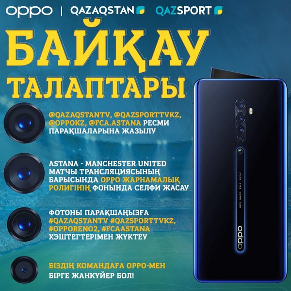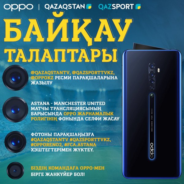 nstagram парақшаңызға шығарыңыз. 4. QAZAQSTANTV парақшасындағы OPPO байқауының соңғы постының астына ДАЙЫН деп жазыңыз. Поймай рекламу OPPO Reno2 в прямом эфире Лиги Европы ASTANA – MANCHESTER UNITED и сделай селфи с хэштегом: astana. и выиграй смартфон флагман — OPPO Reno 2 и футболку с подписями всех игроков футбольного клуба FC ASTANA, а так-же 10 подарочных боксов OPPO! Условия конкурса: 1. Подпишись на официальные instagram страницы: QAZAQSTANTV, QAZSPORTTVKZ, OPPOKZ, FCA.ASTANA. 2. Во время трансляции матча ASTANA – MANCHESTER UNITED поймать рекламу OPPO и сделать селфи фото на фоне рекламного ролика 3. Разместить фото в Instagram с хэштегом: astana. 4. Под последним постом конкурса OPPO на instagram странице QAZAQSTANTV оставить комментарий — ГОТОВО! • По времени Нур-Султан.