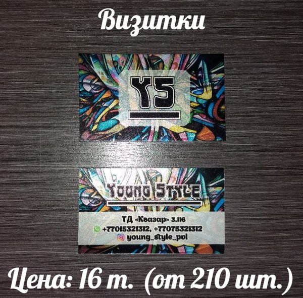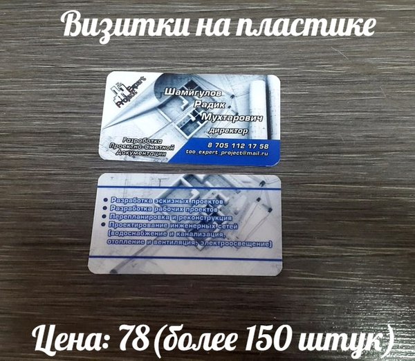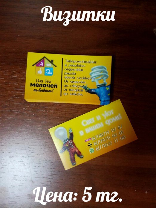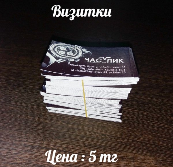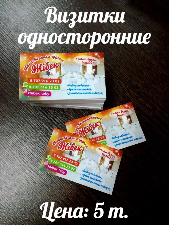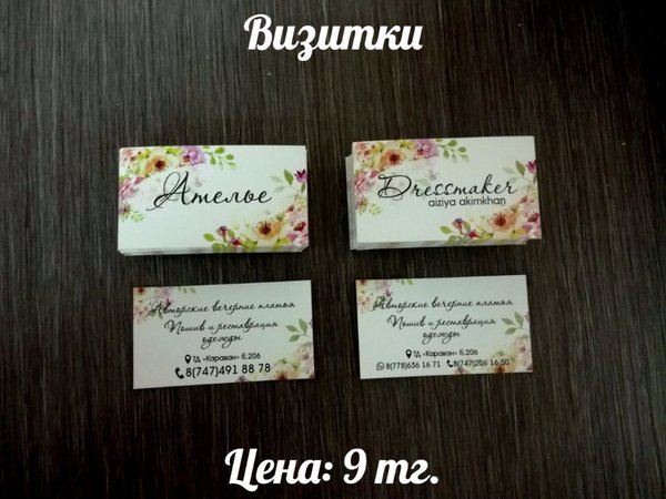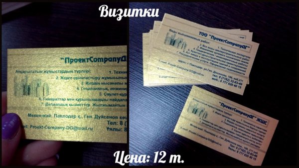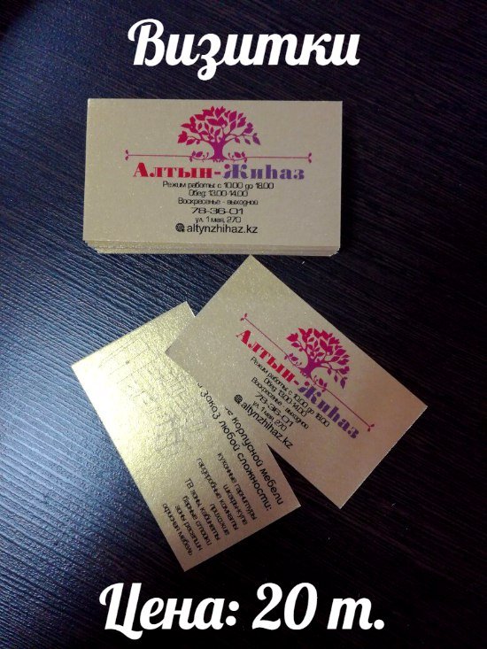 Визитки Печать:лазерная, 4+0 Бумага: ECOSTAR, 250 г/м Цена:5 тг (при заказе от 210 шт.)
