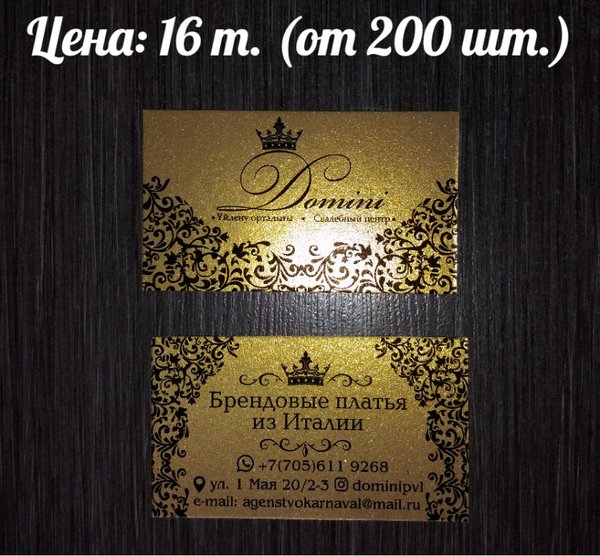 Изготавливаем яркие золотые визитки на фактурной (дизайнерской) бумаге «ЗОЛОТО» по весьма привлекательной для вас цене! Печать: струйная, 4+4 Бумага: Золото Цена:16 т (при заказе от 200 штук)