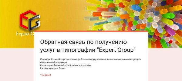 Добрый вечер, уважаемые подписчики! Команда «Expert Group» постоянно работает над улучшением качества оказываемых услуг и выпускаемой продукции. С помощью Вашей обратной связи мы растём. Растём вместе с Вами. Пожалуйста, заполните эту короткую форму. Это займет не более 3-х минут. Спасибо!
