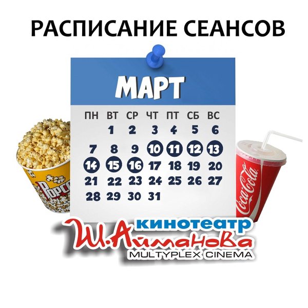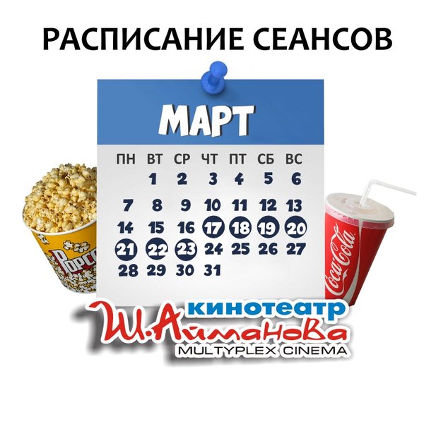 Расписание сеансов кинотеатра имени Шакена Айманова c 17 по 23 марта включительно. ⠀⠀⠀⠀⠀⠀⠀⠀⠀ Администрация кинотеатра может изменить время начала киносеанса и цены на билеты. Пожалуйста, уточняйте информацию по телефону: 33-88-22 (касса), справочная служба) ОБРАТИТЕ ВНИМАНИЕ Убедительно просим Вас при посещении кинотеатра соблюдать дистанцию в 2 метра; Находиться на территории кинотеатра в медицинских масках. Разрешённая заполняемость зрительных мест — 30% от общего количества мест в кинозале. Желаем Вам приятного и безо… — Читать дальше