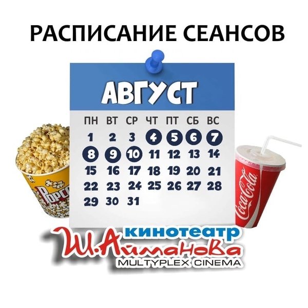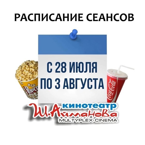 Расписание сеансов кинотеатра имени Шакена Айманова c 28 июля по 3 августа включительно. ⠀⠀⠀⠀⠀⠀⠀⠀⠀ ️Администрация кинотеатра может изменить время начала киносеанса и цены на билеты. Пожалуйста, уточняйте информацию по телефону: 33-88-22 (касса), справочная служба) Желаем Вам приятного просмотра!