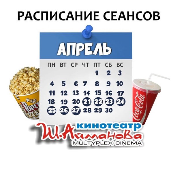 Расписание сеансов кинотеатра имени Шакена Айманова c 21 по 27 апреля включительно. ⠀⠀⠀⠀⠀⠀⠀⠀⠀ Администрация кинотеатра может изменить время начала киносеанса и цены на билеты. Пожалуйста, уточняйте информацию по телефону: 33-88-22 (касса), справочная служба) Желаем Вам приятного просмотра!