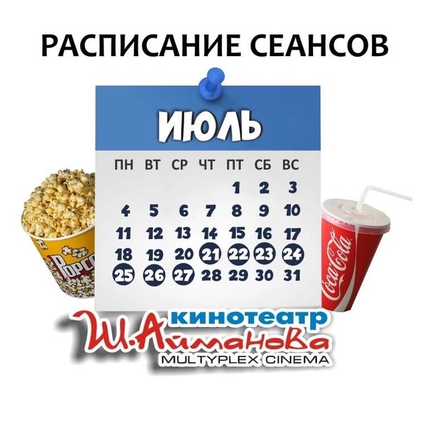 Расписание сеансов кинотеатра имени Шакена Айманова c 21 по 27 июля включительно. ⠀⠀⠀⠀⠀⠀⠀⠀⠀ ️Администрация кинотеатра может изменить время начала киносеанса и цены на билеты. Пожалуйста, уточняйте информацию по телефону: 33-88-22 (касса), справочная служба) Желаем Вам приятного просмотра!