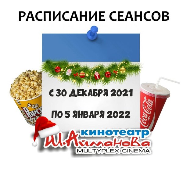 Расписание сеансов кинотеатра имени Шакена Айманова с 30 декабря 2021 по 5 января 2022 включительно. Администрация кинотеатра может изменить время начала киносеанса и цены на билеты. ⠀⠀⠀⠀⠀⠀⠀⠀⠀ Пожалуйста, уточняйте информацию по телефону: 33-88-22 (касса), справочная служба) ОБРАТИТЕ ВНИМАНИЕ Убедительно просим Вас при посещении кинотеатра соблюдать дистанцию в 2 метра; Находиться на территории кинотеатра в медицинских масках. Разрешённая заполняемость зрительных мест — 30% от общего количества мест в кинозале. Желаем Ва… — Читать дальше