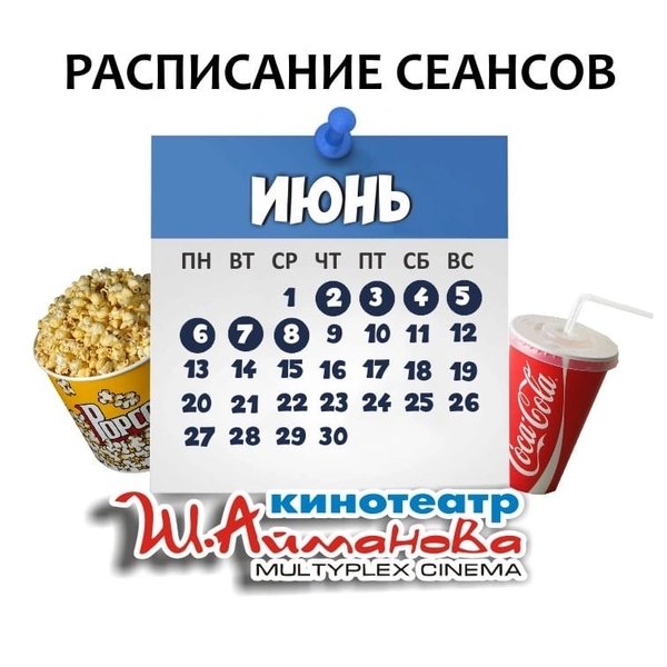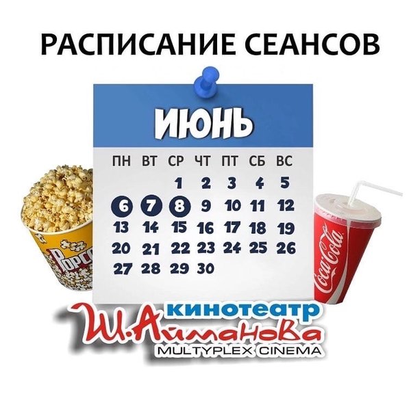 Расписание сеансов кинотеатра имени Шакена Айманова на 6, 7 и 8 июня. ⠀⠀⠀⠀⠀⠀⠀⠀⠀ ️Администрация кинотеатра может изменить время начала киносеанса и цены на билеты. Пожалуйста, уточняйте информацию по телефону: 33-88-22 (касса), справочная служба) Желаем Вам приятного просмотра!