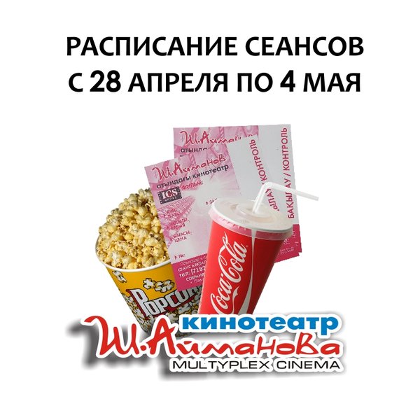 Расписание сеансов кинотеатра имени Шакена Айманова c 28 апреля по 4 мая включительно. ⠀⠀⠀⠀⠀⠀⠀⠀⠀ Администрация кинотеатра может изменить время начала киносеанса и цены на билеты. Пожалуйста, уточняйте информацию по телефону: 33-88-22 (касса), справочная служба) Желаем Вам приятного просмотра!