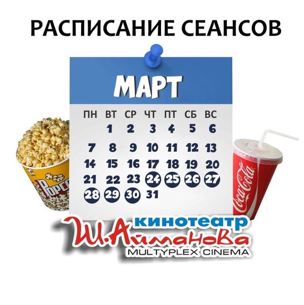 Расписание сеансов кинотеатра имени Шакена Айманова c 24 по 30 марта включительно. ⠀⠀⠀⠀⠀⠀⠀⠀⠀ Администрация кинотеатра может изменить время начала киносеанса и цены на билеты. Пожалуйста, уточняйте информацию по телефону: 33-88-22 (касса), справочная служба) ️ОБРАТИТЕ ВНИМАНИЕ Убедительно просим Вас при посещении кинотеатра соблюдать дистанцию в 2 метра; Находиться на территории кинотеатра в медицинских масках. Разрешённая заполняемость зрительных мест — 30% от общего количества мест в кинозале. Желаем Вам приятного и без… — Читать дальше