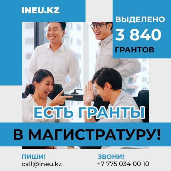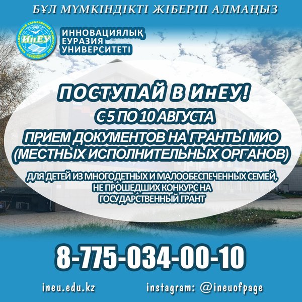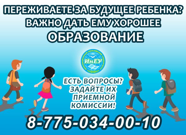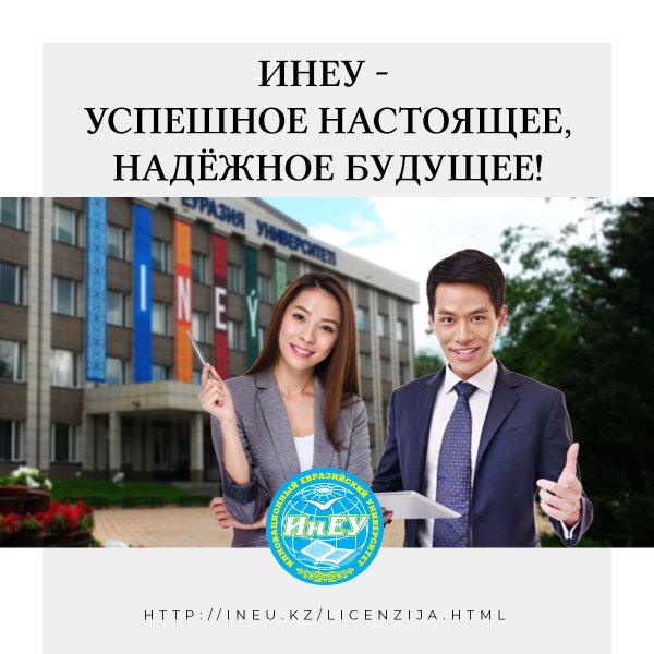 ся БЕСПРОЦЕНТНАЯ ссуда. Этот кредит может оформить не только сам студент, абитуриент или их родители, но и любой доверенный заемщик. Также у тебя есть возможность накапливать баллы за участие в студенческой жизни и расплачиваться ими! Еще один способ оплаты — привлечь абитуриентов в ИнЕУ. Чем больше абитуриентов, тем меньше твоя оплата! Получи семейную льготу для твоих братьев и сестер, для папы и мамы и даже бабушки и дедушки, ведь учиться никогда не поздно. Есть также льготы ведущим спортсменам. 3 УДОБНО СОВМЕЩАТЬ! В ИнЕУ работают программы двудипломного образования. Так, бакалавр или магистрант учится в ИнЕУ и параллельно, дистанционно в другом зарубежном вузе. В результате выпускник двух вузов получает два диплома. ИнЕУ — единственный вуз в регионе, который осуществляет подготовку по программе МВА (Мaster of Вuisness Аdministration). Получай новые знания, и ты готов к открытию своего бизнеса или его развитию! 4 ЗАВОДИТЬ НОВЫХ ДРУЗЕЙ! Ты расширишь круг знакомых благодаря тренингам, семинарам, форумам и поездкам, организуемым в ИнЕУ. Участники тренингов получают знания — ценные, практичные, которые повысят доходы, а также дадут дополнительные вдохновение и мотивацию двигаться вперед. Ты сможешь на этих занятиях учиться бок о бок с топ-менеджерами крупных компаний, собственниками бизнеса. Наши преподаватели регулярно обучается на выездных семинарах в самых крутых университетах мира, у самых топовых экспертов. Полученные знания они передают своим студентам. 5 УВЛЕКАТЕЛЬНО ПУТЕШЕСТВОВАТЬ! Хочешь учиться за границей? Если студент ИнЕУ знает один из иностранных языков, он может проучиться в вузах-партнерах Германии, Польши, Румынии, США, Китая, России и других стран. У ИнЕУ таких вузов-партнеров более 30! Программы международного обмена, финансируемые как казахстанскими, так и зарубежными фондами, обеспечат не только бесплатный проезд и обучение, но и стипендию. 6 ПРИЯТНО ПРОВОДИТЬ ВРЕМЯ! Студенческая пора — самое веселое и продуктивное время. В студенческих клубах ИнЕУ ты найдёшь новых друзей. Тебя примут в компанию дебатёры, музыканты, вокалисты, танцоры, шахматисты, айтыскеры, волонтеры, КВНщики и даже ТВ-ведущие, изучающие сценическую речь и актерское мастерство. Праздники в ИнЕУ проходят весело — с конкурсами, дискотеками и концертами. Поступив в наш университет, ты окунешься в яркую, насыщенную, студенческую жизнь! 7 УСПЕШНО НАЙТИ РАБОТУ. Почему в ИнЕУ уверены в практически стопроцентном трудоустройстве своих выпускников? За счет внедрения дуальной технологии обучения большинство студентов ИнЕУ, начиная со второго курса, знают, где будут работать, а некоторые уже и начинают работать. Выпускники ИнЕУ имеют хорошую перспективу трудоустройства. Они трудятся и повышают свою квалификацию не только в Казахстане, но и в России, Германии, США, других странах евразийского пространства. У нашего университета порядка 150 работодателей-партнеров. В ИнЕУ можно получить образование, соответствующее Госстандарту РК, с выдачей диплома государственного образца, и международное с выдачей диплома вузов России, Германии, США. В университете обучаются свыше восьми тысяч студентов, в том числе по государственным образовательным грантам казахстанских и иностранных предпринимателей, акимов городов и районов. Лучшие студенты ИнЕУ являются обладателям