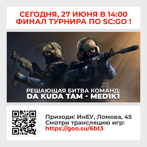 Сегодня, 27 июня в 14:00 в ИнЕУ решающий бой по CS: GO! Состоятся финальные игры отборочного турнира по компьютерной игре Counter-Strike: Global Offensive! МАКСИМАЛЬНЫЙ РЕПОСТ!!! ⠀ Битва команд – лидеров турнира: Da Kuda Tam и Med1k1 ⠀ Они встретятся лицом к лицу в формате LAN в Большом зале ИнЕУ по Ломова, 45. ⠀ Приглашаем всех любителей киберспорта! Приходите, болейте, тусуйтесь, общайтесь! ⠀ Трансляция на YouTube ИнЕУ по ссылке: ⠀ Отборочный турнир ИнЕУ по CS: GO собрал 50 частников (10 команд). 22—24 июня прошли отборочные матчи… — Читать дальше