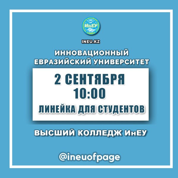 ИнЕУ және ИнЕУ жоғары колледж студенттері! Білім күніне арналған салтанатты жиын 02.09.2019 ж. сағат 10:00-де Ломов көшесі, 45. Біз сіздерді күтеміз! ⠀ 2 сентября в 10:00 линейка для студентов ИнЕУ и ВКИнЕУ. ⠀ Главный корпус ИнЕУ, ул. Ломова, 45, центральный вход. ⠀ Свою группу найдёте по табличкам. ⠀ Форма одежды — парадная. ⠀ С началом учебного года! ⠀