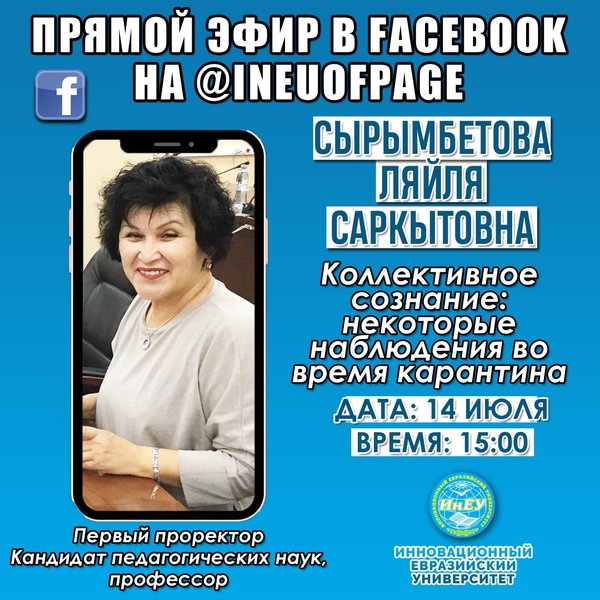 Внимание! Приглашаем всех на прямой эфир на тему: «Коллективное сознание во время карантина». ⠀ Спикер: профессор Ляйля Саркытовна Сырымбетова, первый проректор ИнЕУ, кандидат педагогических наук. ⠀ Когда: 14 июля в 15:00 Где: ⠀