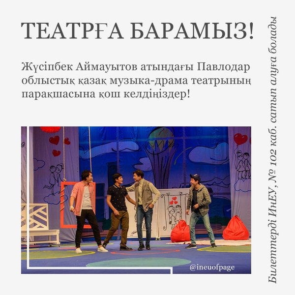 ай, кез-келген адамның басына түсуі мүмкін. Пьеса көрермендерді ата-аналарын, туған-туысқандарын сыйлауға, бағалауға шақырады. ⠀ 20 қыркүйек, 19:00 — Қ. Жүнісовтің «Ғашықтар хикаясы» /Комедия/ Реж.: Ә. Ақанов. Екі студент дос Ермек пен Рүстем сүйген қыздарына сезімдерін айтып білдіре алмай қиналады. Көп ойланып-толғанып балгер Ақмақтаның көмегіне жүгінеді. Бірақ соңғы сәтте балгер келе алмай қалып, достар Дастан әріптестеріне әйел киімін кигізіп, ойларын іске асырмақ болады. Оқиға қызған сәтте күтпеген жерден балгер өзі келе қалады.Қойылым ойнақы, күлкілі сәттері көп, ән шырқалады, би биленеді. ⠀ Билеттерді ИнЕУ Жастар ісі жөніндегі комитетінен, № 102 кабинетте сатып алуға болады. Билет бағасы: 500 теңге ⠀