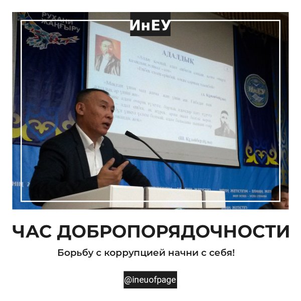 әлеуметтік мәселелер басқармасының басшысы Шынболат Ташеков студенттерге олардың құқықтары бұзылған жағдайда ақпараттық стендтерде көрсетілген сенім телефоны арқылы хабарласа алатынын еске салды. Арнайы мониторинг қызметінің мүшесі Жанғазы Еркеғали елде парасатты азаматтар көп болса, сыбайлас жемқорлық соғұрлым аз болады деп санайды. Студенттер үшін парасаттылыққа бірінші қадам-шпаргалкасыз емтихан тапсыру. Осы жылы Халықаралық сыбайлас жемқорлыққа қарсы рейтингте Қазақстан ТМД елдерінің көпшілігінен озып, 31 орынға көтерілді. — Бәрі бұл жеткіліксіз екенін түсінеді. Сондықтан кеше Президент Жолдауда сыбайлас жемқорлыққа қарсы әрекет етудің жалғасатынын атап өтті, — деп атап өтті Еркеғали. Жақын арада ИнЕУ-дің пікірталас алаңында студенттердің полиция, прокуратура және ҰҚК қызметкерлерімен кездесуі өтеді. ______________________________ Сегодня в ИнЕУ, как и во всех учебных заведениях Казахстана, прошёл «Час добропорядочности», посвящённый борьбе с коррупцией. В нём участвовало более 250 первокурсников. Как отметил сотрудник областной антикоррупционной службы Ерсултан Амирханов, в центральном аппарате Агентства РК по противодействию коррупции создан Департамент добропорядочности, который занимается формированием антикоррупционной культуры у населения. Амирханов рассказал, что в двух вузах Павлодара созданы антикоррупционные лаборатории «SANALY URPAQ», в которых студенты обсуждают формы противодействия коррупции, чтобы преподаватели не брали взятки, не препятствовали сдаче сессии и т.д. Руководитель управления по воспитательной работе и социальным вопросам ИнЕУ Шынболат Ташеков напомнил студентам, живущим в общежитии, что в случае нарушения их прав они могут обратиться по телефону доверия, указанному на информационных стендах. Горячую дискуссию вызвало выступление Жангазы Еркегали, члена специальной мониторинговой службы. Он считает, что борьба с взятками начинается с самовоспитания каждого человека. Чем больше в стране добропорядочных граждан, не терпимых к нарушениям, тем меньше коррупции. Для студентов первый шаг к добропорядочности — сдача экзаменов без шпаргалок. В этом году в антикоррупционном рейтинге, проводимом Transparency International, Казахстан поднялся на 31 место, опередив большинство стран СНГ. — Все понимают, что этого не достаточно. Поэтому вчера в послании Президент обозначил, что будет продолжаться противодействие коррупции, — подчеркнул Еркегали. В ближайшее время на дискуссионной площадке ИнЕУ пройдут встречи студентов с сотрудниками полиции, прокуратуры и КНБ.