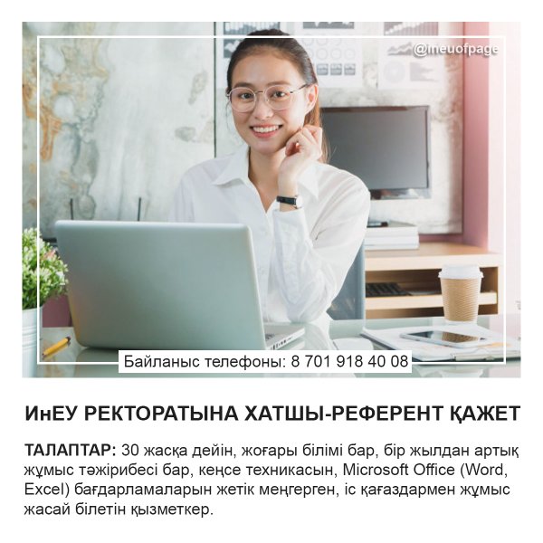 ИнЕУ ректоратына хатшы-референт қажет! ⠀ Талаптар: 30 жасқа дейін, жоғары білімі бар, бір жылдан артық жұмыс тәжірибесі бар, кеңсе техникасын, Microsoft Office (Word, Excel) бағдарламаларын жетік меңгерген, іс қағаздармен жұмыс жасай білетін қызметкер. ⠀ Байланыс телефоны: ⠀