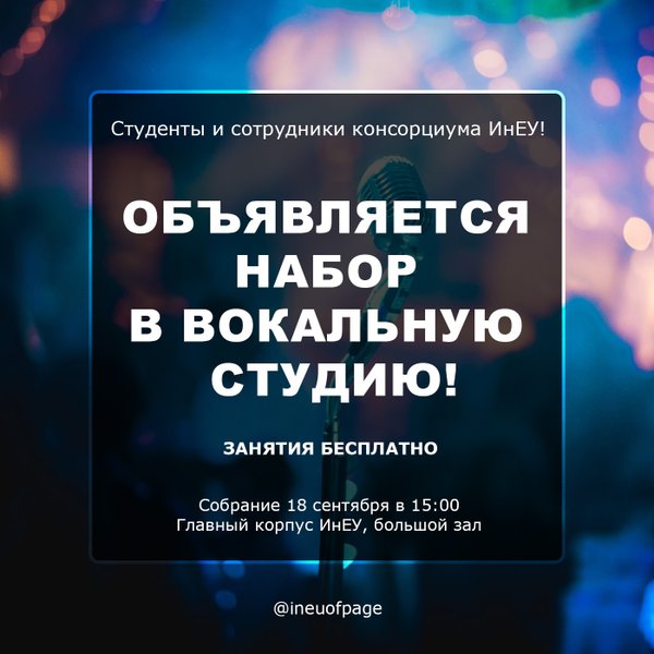 ИнЕУ консорциумының студенттері мен қызметкерлері! ⠀ Вокалдық студияға қабылдау жарияланады! Тегін. ⠀ Жиналыс 18 қыркүйек сағат 15:00 ИнЕУ бас ғимараты, акт залы. ⠀ Cтуденты и сотрудники консорциума ИнЕУ! ⠀ ОБЪЯВЛЯЕТСЯ НАБОР В ВОКАЛЬНУЮ СТУДИЮ! Занятия бесплатные. ⠀ Собрание 18 сентября в 15:00 Главный корпус ИнЕУ, большой зал. ⠀