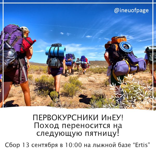 Первокурсники ИнЕУ! Поход переносится на следующую пятницу. Сбор 13 сентября в 10:00 на лыжной базе «Eris». Усольский микрорайон, за бассейном Ertis Olympic, ул. Усолка, 1Б. Проезд автобусами № 1, 1Э, маршрутками № 003, 6, 66, 151, остановка Лыжная база.