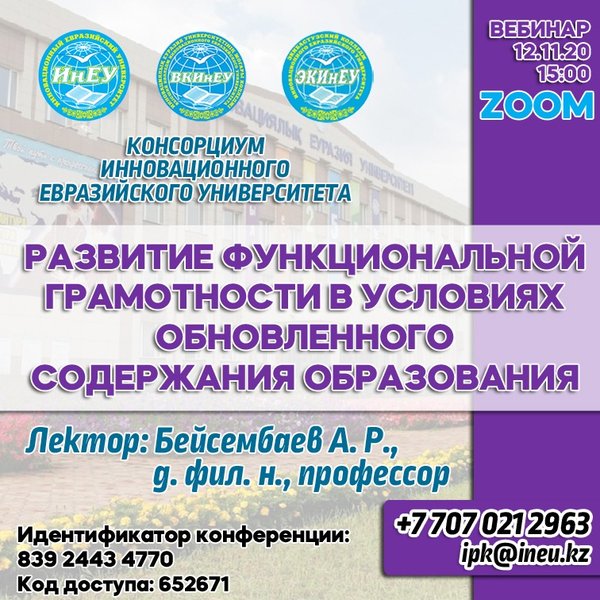 Уважаемые преподаватели школ, колледжей и вузов Казахстана! Приглашаем вас на вебинар «Развитие функциональной грамотности в условиях обновленного содержания образования». ⠀ Организатор: Инновационный евразийский университет. ⠀ Лектор: профессор Амангельды Ракишевич Бейсембаев, д.фил.н. ⠀ ⏰ Начало вебинара в ZOOM: 12 ноября в 15:00. Идентификатор конференции: 839 2443 4770 Код доступа: 652671 ⠀ Вопросы по телефону: E-mail: ipk@ineu.kz ⠀