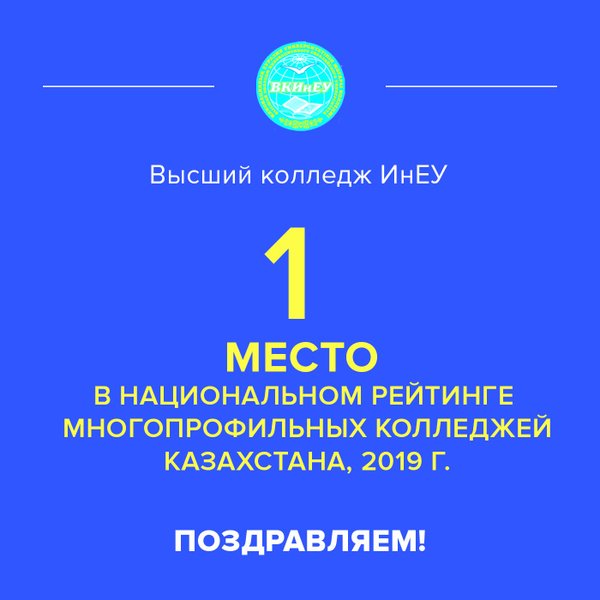 Поздравляем коллектив и студентов Высшего колледжа ИнЕУ с высокой и заслуженной оценкой — первым местом в национальном рейтинге многопрофильных колледжей Казахстана! ⠀ 10 лет исследования работы учебных заведений Казахстана проводит Независимое агентство по обеспечению качества образования IQAA-Ranking г. Нур-Султан. ⠀ Несколько лет ВКИнЕУ занимает в рейтинге колледжей страны первые места и лидирующие позиции. Подробнее на сайте: ⠀ Приёмная комиссия ВКИнЕУ работает по адресу: ул. Ломова, 45. Тел.: ⠀