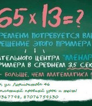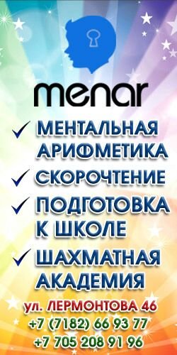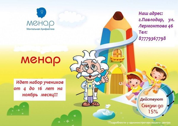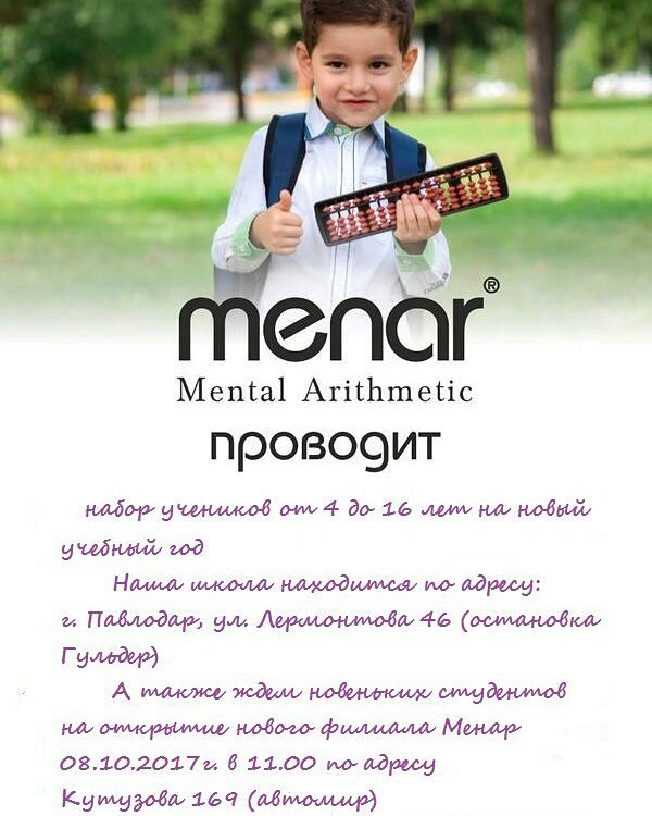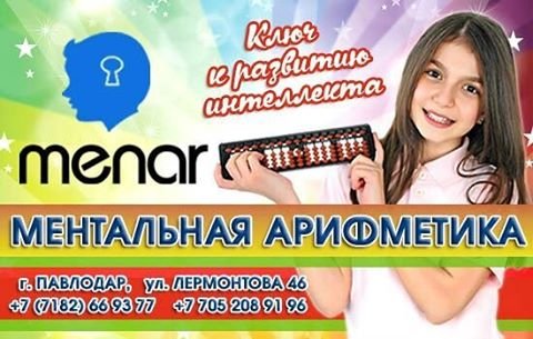 Центр Международной школы Ментальной Арифметики МЕНАР объявляет набор групп от 5 до 16 лет!!! В методику МЕНАР входит: 1. развитие логики и памяти; 2. концентрация внимания; 3. аналитическое и творческое мышление; 4. развитие речи, слуха и наблюдательности; 5. элементы скорочтения. Наш адрес: г.Павлодар, ул.Лермонтова д.46. (Ост-ка Гульдер). ,,,