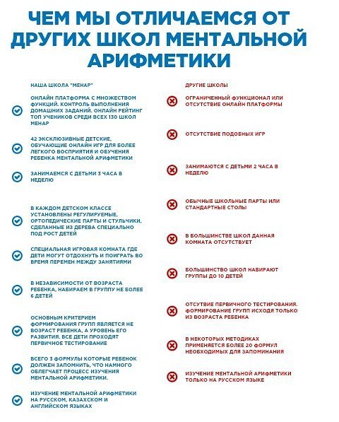 аете, насколько ваш ребенок готов к обучению, понравится ли вам центр, преподаватель и методика обучения. Пробное занятие помогает определить уровень готовности ребенка к обучению и группу, в которую ребенок может посещать комфортно для себя. 2. УТОЧНИТЕ КОЛИЧЕСТВО ДЕТЕЙ В ГРУППЕ. В МЕНАР мы тщательно придерживаемся такого принципа — малышей (5—7 лет) должно быть не больше 5—6 человек в группе, дети постарше (8—11 и 12—16 лет) — до 8—10 человек в группе. Это один из самых важных пунктов, потому что маленькие дети очень быстро устают, с трудом концентрируют внимание и им нужно постоянное внимание преподавателя. Если группа будет большая, то ребенок не будет успевать выполнять задания, а учитель не сможет контролировать всех и видеть задачи, которые нужно откорректировать. К сожалению, к нам все чаще обращаются родители, дети которых занимались в других центрах в группах из целого класса. Зачем это делается, мы понимаем – так удешевляется стоимость обучения, но дает ли она качество? Система занятий «как в школе» и большого количества детей в группе дискредитирует саму идею занятий ментальной арифметикой, когда внимание уделяется каждому ребенку; 3. НАЛИЧИЕ ОНЛАЙН ПЛАТФОРМЫ. Обязательно обратите на это внимание! Если вам в учебном центре предлагают обучение только с помощью абакуса (счеты) и каких — то рабочих тетрадей или распечатанных материалов на листках — это означает, что данная методика значительно отстает по уровню от инновационного обучения. Или, что еще страшнее, вообще не имеет ничего общего с настоящей методикой преподавания ментальной арифметики. Современные дети отлично ладят со всеми телефонами, планшетами, ноутбуками, а мир все больше становится мобильным. Использование только книг и тетрадей сводит “на нет” всю эффективность занятий, а дети перестают заниматься с интересом. Отсутствие онлайн платформы также удешевляет обучение, но снова возникает вопрос к родителям – а за что вы платите и какой результат вы получите на выходе? Наличие онлайн платформы дает возможность вашему ребенку быть зарегистрированным в международной системе ментальной арифметики, иметь доступ к выполнению домашних, контрольных и развивающих упражнений, следить за своими текущими результатами и сравнивать свои достижения с предыдущими. 4. СТОИМОСТЬ ОБУЧЕНИЯ. Проведите небольшое исследование стоимости обучения ментальной арифметике в вашем городе. Если вы видите очень низкую цену, это скорее всего связано с теми вопросами и проблемами, которые мы перечислили выше. Интеллектуальный труд, разработка методики, постоянное ее совершенствование, появление новых технических разработок, обучение и подготовка преподавателей – это все стоит определенных финансовых ресурсов. Низкая цена формируется за счет отсутствия серьезных интеллектуальных вложений, увеличения количества детей в группе. 5. Обратите внимание на название и методику по которой преподают в центре, ОТКУДА РОДОМ МЕТОДИКА, ИМЕЕТ ЛИ ОНА ПАТЕНТ? Методика МЕНАР имеет патент, она максимально адаптирована к современному образованию, постоянно обновляется и усовершенствуется, делая акцент на развитие обоих полушарий головного мозга. Результат этого – отличная память, умение концентрировать внимание и одновременно выполнять несколько заданий, развитие творческих наклонност