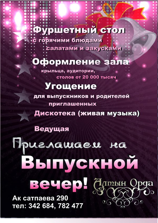 ПРИГЛАШАЕМ НА ВЫПУСКНОЙ ВЕЧЕР К НАМ В РЕСТОРАН ИЛИ ВЫЕЗЖАЕМ К ВАМ С ФУРШЕТОМ.СТОИМОСТЬ 5000 ТЕНГЕ С ЧЕЛОВЕКА.