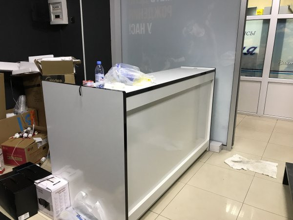 Пришла по чертежам стойка администратора, которая стоит вместе со всяким хламом Приехали столики, стойка для одежды и скоро начнется сборка шлемов виртуальной реальности HTC Vive!!