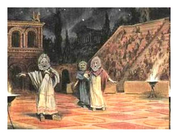 тёра-декламатора. Декламатор, которого в VI веке до н. э. называли «гипокритом» («ответчиком» или «комментатором»), мог вступать в диалог с хором, изображать по ходу повествования различных персонажей мифов, и таким образом к диалогу примешивались элементы актёрской игры. Позже Эсхил добавил к хору второго актёра-декламатора, а Софокл третьего, — в V веке до н. э. «гипокриты» уже могли общаться не только с хором, но и между собой, что сделало возможным драматическое действие, независимое от хора, и в результате — преобразование хора сатиров в драму.