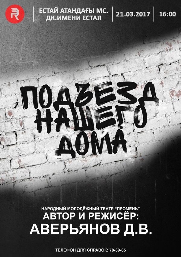 21 МАРТА В 16:00 Спектакль «подъезд нашего дома». Эта история произошла у нас в Павлодаре во времена перестройки. Очень интересная историческая постановка о том времени, про которое мало кто знает из молодых людей. ВЫ МОЖЕТЕ ПРИОБРЕСТИ ЭЛЕКТРОННЫЙ БИЛЕТ на этот спектакль, не выходя из дома, минуя очереди в кассе. В этой группе, ниже, в рубрике «товары», нажав на афишу «Подъезд нашего дома», вы сможете приобрести электронный билет. Стоимость билета 300 тенге.