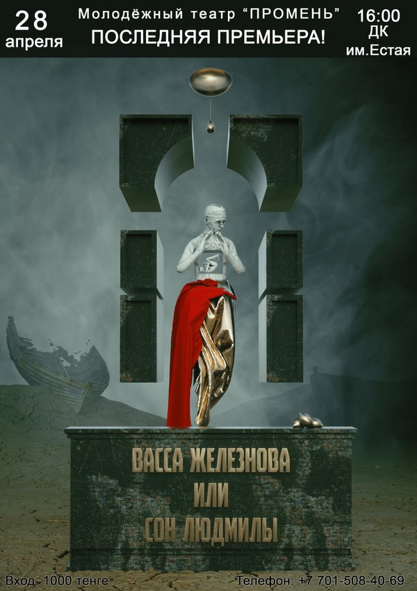 ПОСЛЕДНЯЯ ПРЕМЬЕРА ТЕАТРА! 28 апреля 16:00 ДК им.Естая Спектакль «ВАССА ЖЕЛЕЗНОВА, или сон Людмилы» по пьесе Максима Горького Совместный проект театра «Промень», Голливудской школы, театральной школы-студии «ЛУЧ» режиссёр Денис Аверьянов В ролях: Наталья Ртищева, Сергей Кошляк Карина Терёшина Альбина Пудовикова Тамара Галата Светлана Калиничева Богдан Матыскин Владислав Кукунов Анна Емельянова Инга Бальцер Иван Валов Стоимость билета: 1000 тенге. Билеты приобретаются при входе в зал.