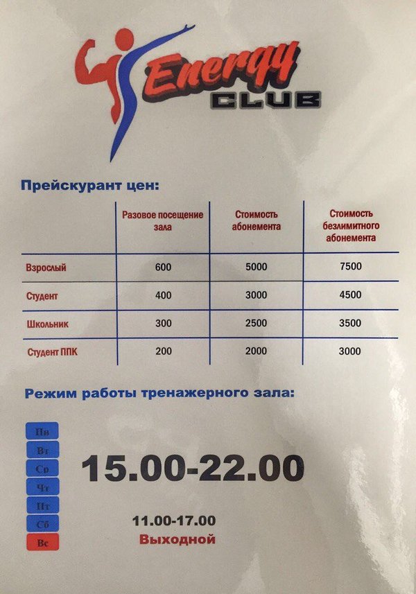 Часы работы «Energy CLUB» Пн/Пт 15:00—21:00 Сб 9:00—15:00 Вс выходной
