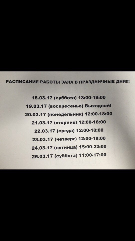 Добрый вечер дорогие Друзья! Мы Рады сообщить Вам что наш зал продлевает время работы!!! Пн./Пт. 15:00—22:00 Сб 11:00—17:00 Вс выходной А так же, вводим безлимитный абонемент, который позволит Вам посещать наш зал каждый день в течении месяца!!! Приходите будем рады!