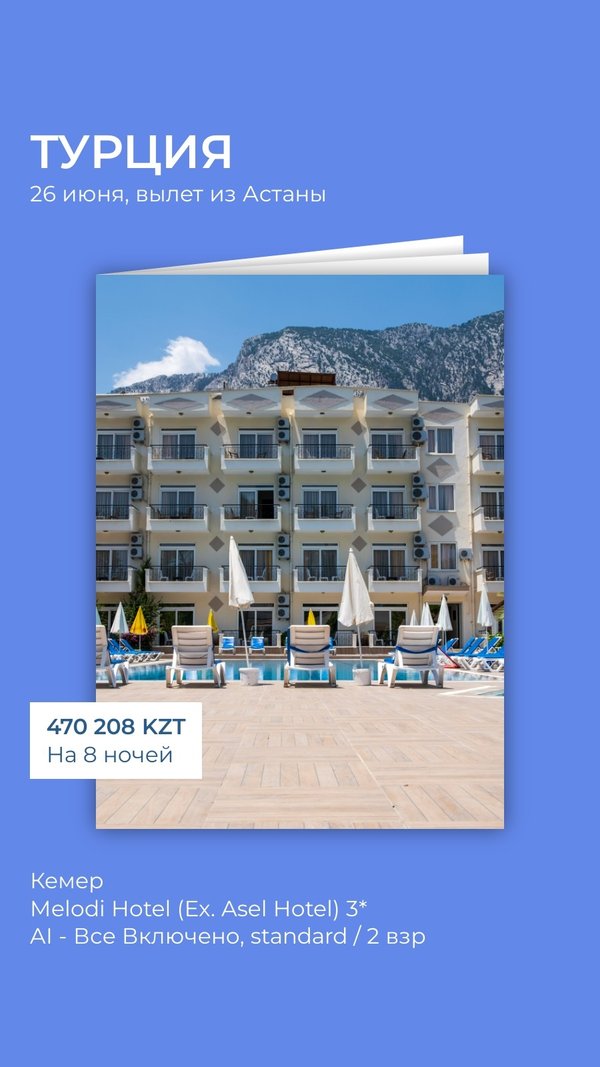 Роман Тур (27.08.2025): Турция по суперцене! Только сейчас — **53% скидка** на роскошный отдых у моря! **5\*** отель в Аланье Турция Вылет из Астаны: **6 сентября** На **6 ночей** Цена: **298 920 тг/чел** (вместо 627 892 тг) Всё, что нужно для идеального отпуска: — Песчаные пляжи и тёплое море — Высокий сервис и комфорт 5\* — Отличный выбор для пар и семей Спешите! Таких цен больше не будет. @roman.tour.pvl | +7 773 680 30 6 Турция по суперцене!