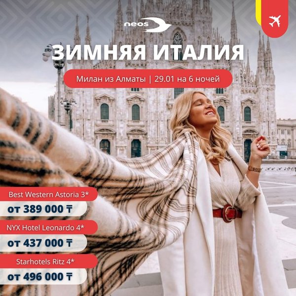 Зимняя Италия – это волшебство, раскрывающее свою аутентичность в каждом уголке: от красивых горнолыжных курортов до уютных городских улочек, где можно насладиться атмосферой праздников. Это место, где впечатления от заснеженных альпийских склонов и вкуснейших итальянских блюд создают неповторимый вечерний романтический настрой. Милан из Алматы | 29.01 на 6 ночей от 389 000 ₸ Милан из Алматы | 05.02 на 6 ночей от 472 000 ₸ Наши контакты: ул.Торайгырова 113 оф.6 гостиница «Алтын-Отау» 4 этаж за ресепшн WhatsApp