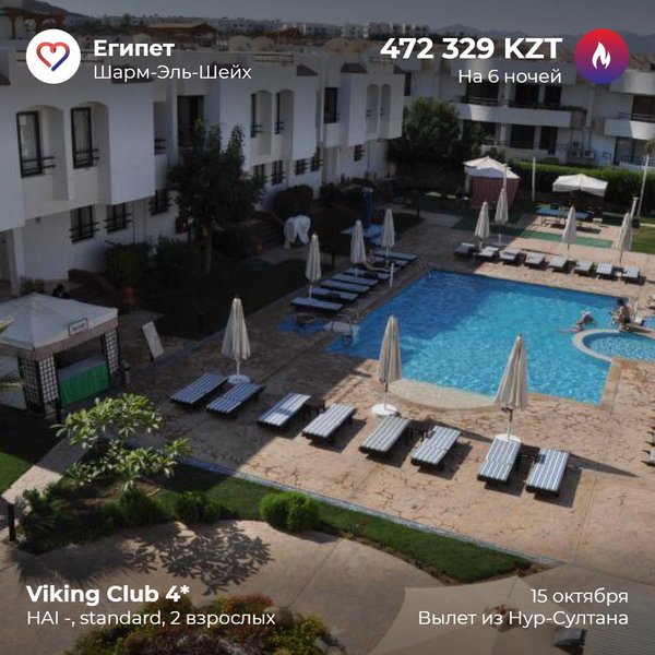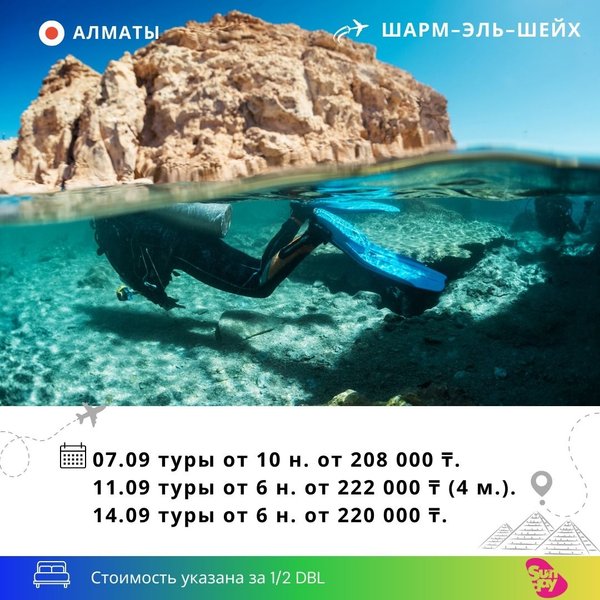 Роман Тур (25.08.2025): Спецпредложение! Египет ждёт вас! Отдыхайте в роскошном **SUNRISE DIAMOND BEACH RESORT 5\*** с сервисом премиум-класса. Вылет из Астаны — **9 сентября** 7 ночей Всё включено (**All Inclusive**) Цена: **789 978 тг (1 027 572 тг)** на человека Скидка — **23%** Не упустите шанс провести идеальный отпуск у Красного моря! Забронируй в **Роман-Тур** уже сегодня! Спецпредложение! Египет ждёт вас!