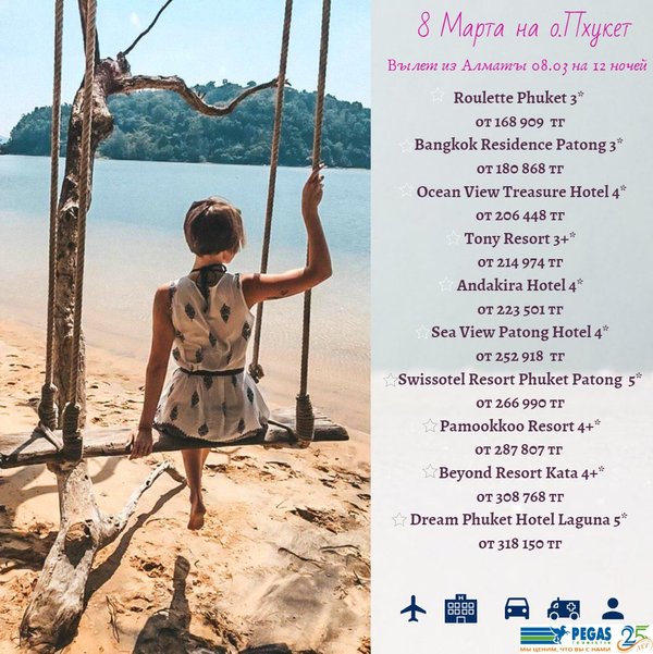 DUSIT LAGUNA (PHUKET) 5*- от 609 тыс. ₸ PP DBL HYTON LEELAVADEE PHUKET 3*-от 291 тыс. ₸ PP DBL PHOENIX HOTEL KARON BEACH 4*- от 378 тыс. ₸ PP DBL PROUD PHUKET 4*- от 351 тыс. ₸ PP DBL