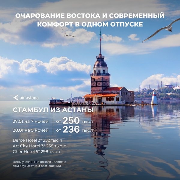 Стамбул: Очарование Востока и современный комфорт в одном отпуске Стамбул из Астаны а/к Air Astana 27/01 на 7 ночей от 250 тыс.т 28/01 на 5 ночей от 236 тыс.т Berce Hotel 3 252 тыс. т Art City Hotel 3 258 тыс. т Cher Hotel 5 298 тыс. т Цены актуальны на момент рассылки Цены указаны на одного человека при двухместном размещении Наши контакты: ул.Торайгырова 113 оф.6 гостиница «Алтын-Отау» 4 этаж за ресепшн WhatsApp
