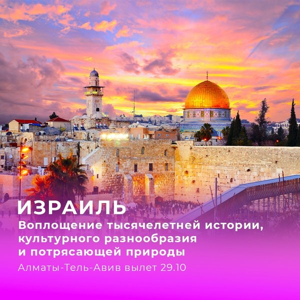 сства. 3. Природные красоты: — От Мёртвого моря с его уникальными лечебными свойствами до Голанских высот с живописными ландшафтами, Израиль удивит вас своей природой. 4. Вкусная кухня: — Не забудьте попробовать местные деликатесы, такие как фалафель, хумус и свежие фрукты на рынках. 5. Пляжи Средиземного моря: — Израильское побережье известно своими красивыми пляжами и возможностями для водных видов спорта. 6. Виноделие: — Израиль славится своими винодельнями и предлагает экскурсии по винодельням. Алматы-Тель-Авив – Алматы каждый четверг и воскресенье Вылет из Алматы 29.10: Экскурсионный тур Панорама Израиля – от 673 000 KZT на человека Экскурсионный тур CITY BREAK 2 города (по воскресеньям) — от 975 000 KZT на человека