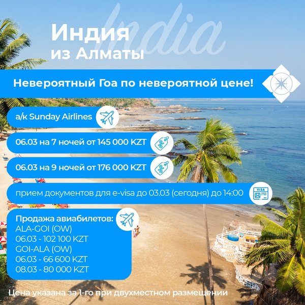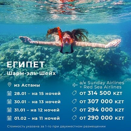Astana 27.01 на 14+1 ночей от 573 000 KZT Бангкок а/к Air Astana 25.01 на 6 ночей от 436 000 KZT Турция Анталия а/к Air Astana 03.02 на 7 ночей от 189 000 KZT Египет Шарм-Эль-Шейх а/к Sunday Airlines + Red Sea Airlines 02.02 на 12 ночей от 290 000 KZT Италия а/к Neos экскурсионные туры 19.01 на 6 ночей от 811 000 KZT Вьетнам а/к VietJet 25.01 на 6 ночей от 388 000 KZT Китай а/к SCAT Airlines 20.01 на 11 ночей от 338 000 KZT Индия а/к Sunday Airlines 27.01 на 7 ночей от 306 000 KZT Мальдивы а/к Air Astana 26.01 на 12 ночей от 668 000 KZT Шри-Ланка а/к Air Astana 23.01 на 11 ночей от 422 000 KZT из АКТОБЕ Египет Шарм-Эль-Шейх а/к Sunday Airlines 09.03 на 11 ночей от 271 000 KZT из ШЫМКЕНТА Египет Шарм-Эль-Шейх а/к Sunday Airlines 13.02 на 9 ночей от 259 000 KZT ОАЭ Дубай а/к flydubai 24.01 на 10 ночей от 329 000 KZT Цена указана за 1 человека при двухместном размещении Спешите бронировать.