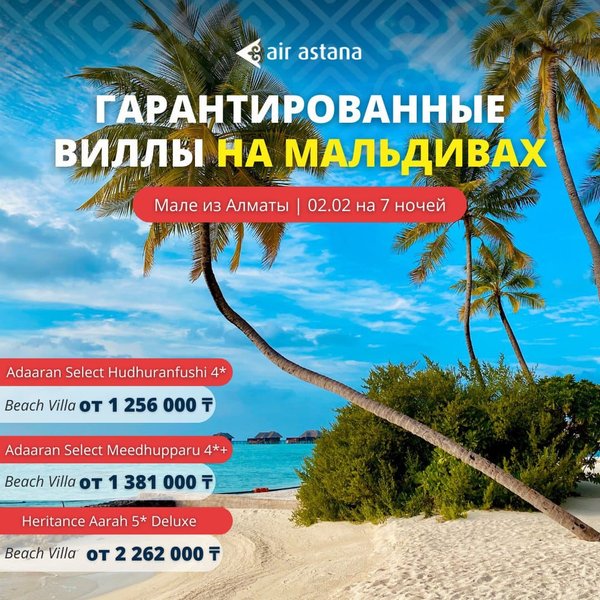 Мальдивы — это не просто архипелаг изумительных коралловых островов, а истинное уединенное раем, где бирюзовые воды Индийского океана обнимают белоснежные пляжи, создавая идеальную картину для незабываемого отдыха. Гарантированные номера в самых любимых отелях Мальдив : • Adaaran Hudhuranfushi 4 — Beach Villa • Heritance Aarah 5 — Beach Villa • Adaaran Meedhuparru 4 — Beach Villa У гарантированных вилл вероятность подтверждения вышe! Наши контакты: ул.Торайгырова 113 оф.6 гостиница «Алтын-Отау» 4 этаж за ресепшн WhatsApp
