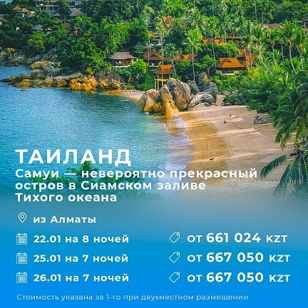 Роман Тур (25.08.2025): Таиланд ждёт вас по супер-цене! **WEKATA LUXURY 4\*** Вылет из Астаны — 29 августа 11 ночей Завтрак включён Стоимость: **423 870 тг (617 253 тг)** на человека Скидка — **31%** Популярный отель на Пхукете: стильные номера, бассейн, шаговая доступность к пляжу и высокий сервис. Забронируйте прямо сейчас с **Роман-Тур** и подарите себе роскошный отпуск в Таиланде!